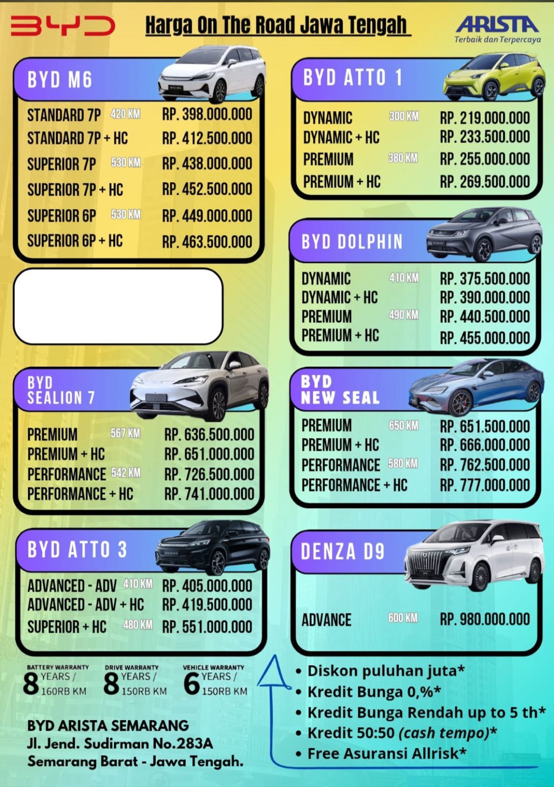 Selamat datang di Dealer Resmi BYD Jawa Tengah. Kami hadir sebagai pusat penjualan resmi BYD dengan layanan terbaik, harga paling kompetitif, serta promo menarik untuk seluruh wilayah Jawa Tengah hingga Indonesia.